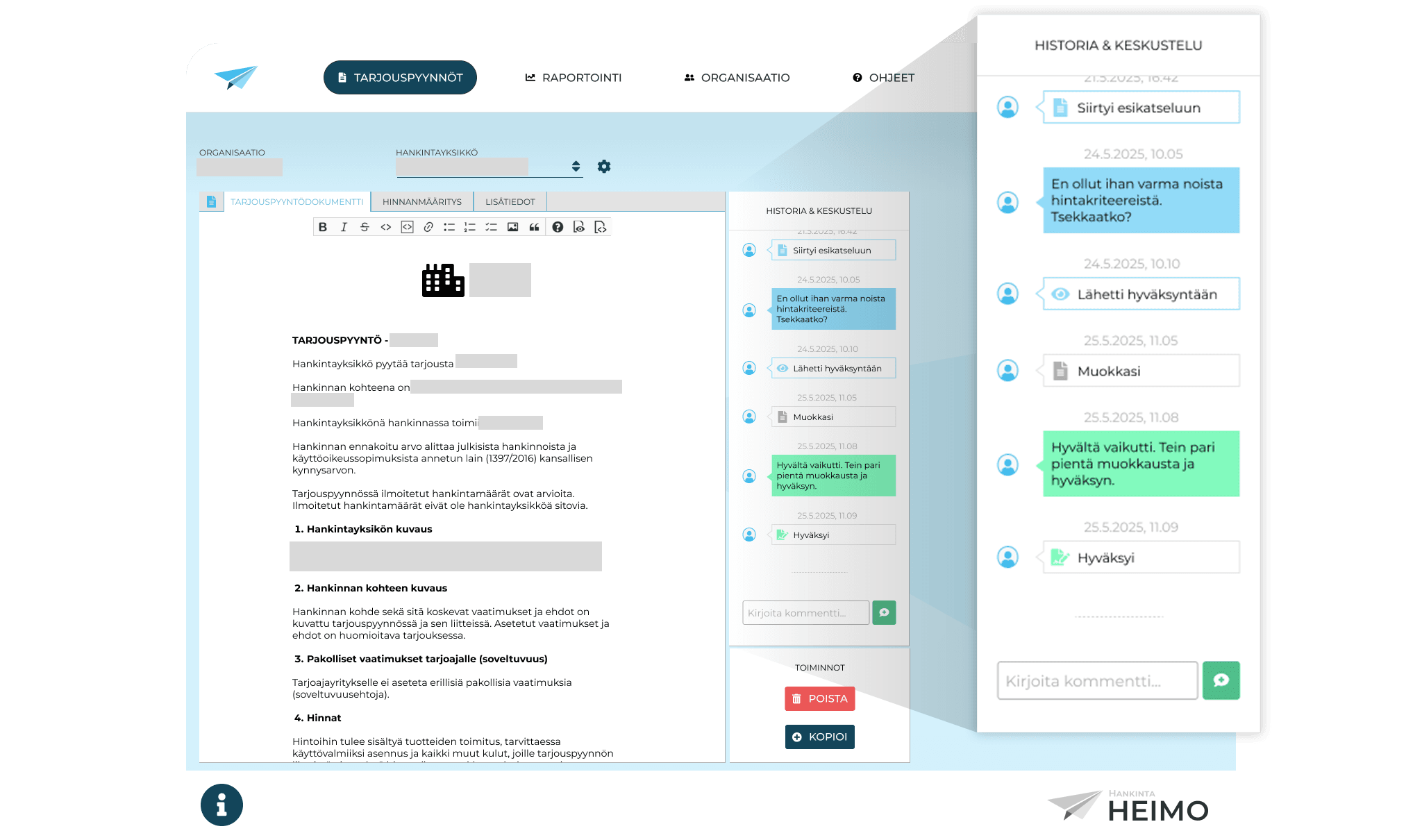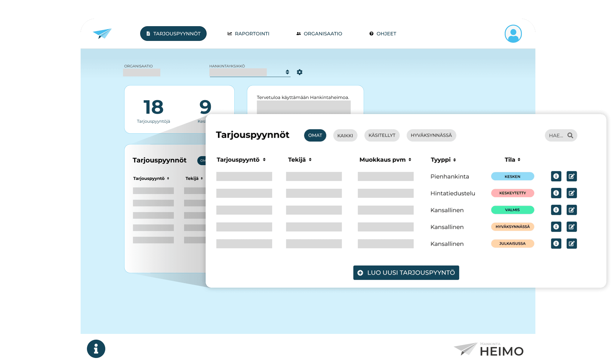 HankintaHeimo on tarjouspyyntöautomaatti palveluksessasi. Sen avulla säästät aikaa ja varmistat tarjouspyyntöjesi laadun.
