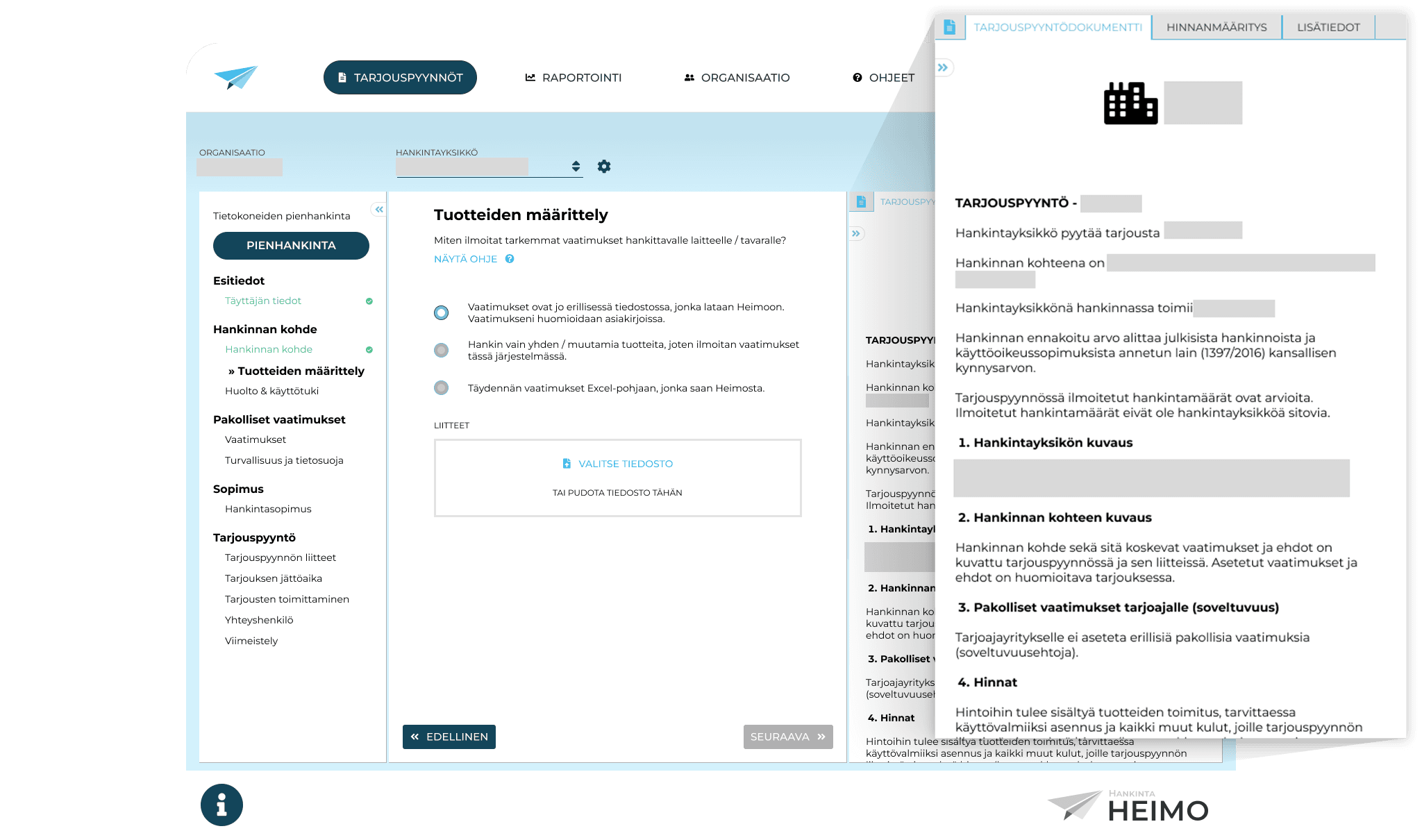 HankintaHeimo on intuitiivinen ja älykäs ohjelmisto, joka johdattaa sinut tarjouspyynnön valmisteluprosessin läpi. Prosessi sujuu ennennäkemättömän nopeasti, laadukkaasti ja helposti.